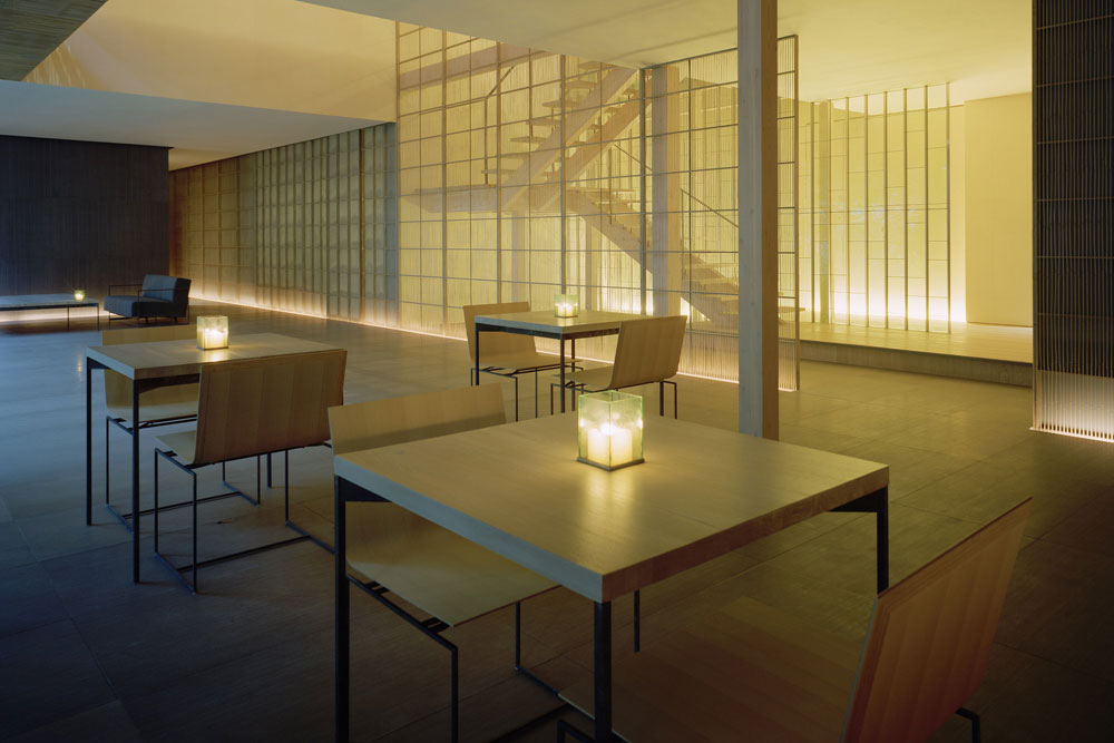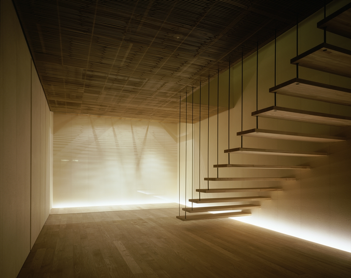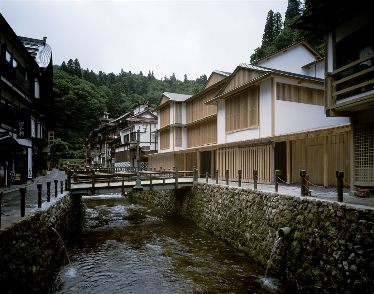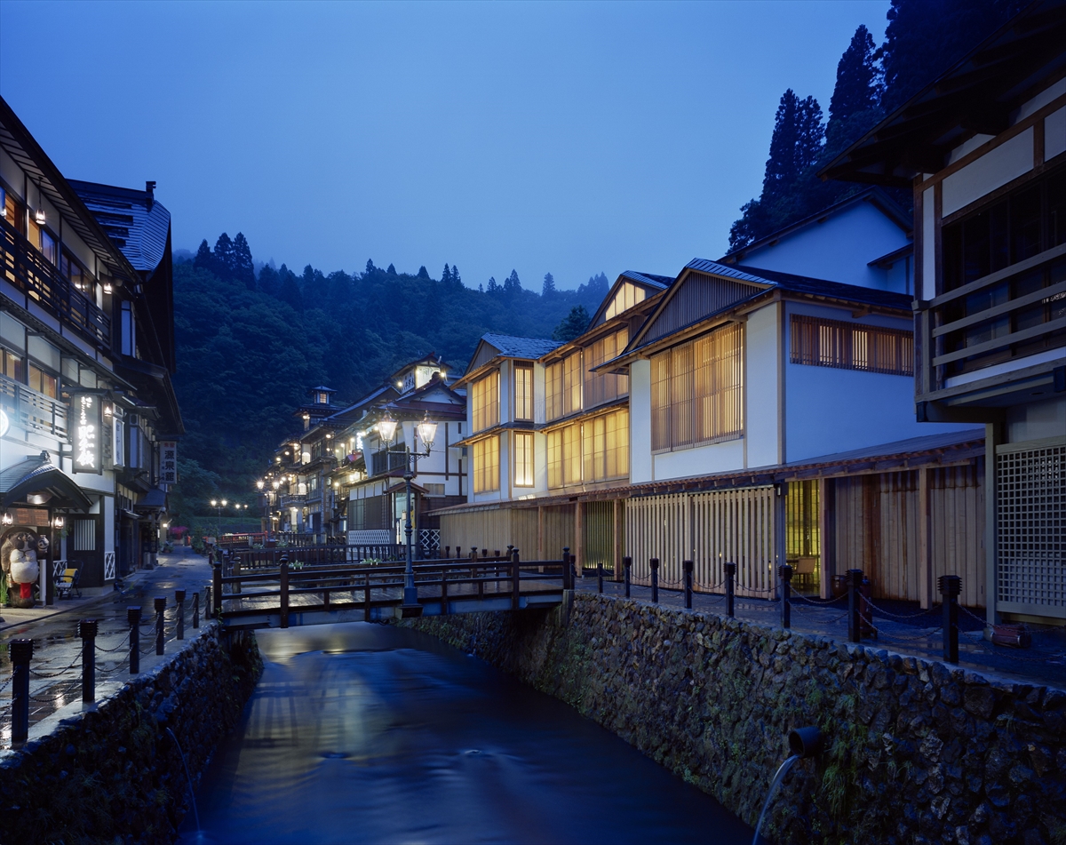 In very small secluded hot spring in Yamagata , Ginzan-Onsen flourished in 1600 for their silver mines. Now hardly any trace of mines except fine quality of mineral contained hot spring. The resort was built in Taisho style architecture with some western influence yet had strong image of traditional Japanese architecture. Architect Kuma was asked to renew one of the most important Inn in the area to receive guests not only from Japan, but from abroad as well. Kuma came out with very interesting design with manipulating Japanese traditional vocabulary overlaying with lighting which is very unique in Ryokan lighting.