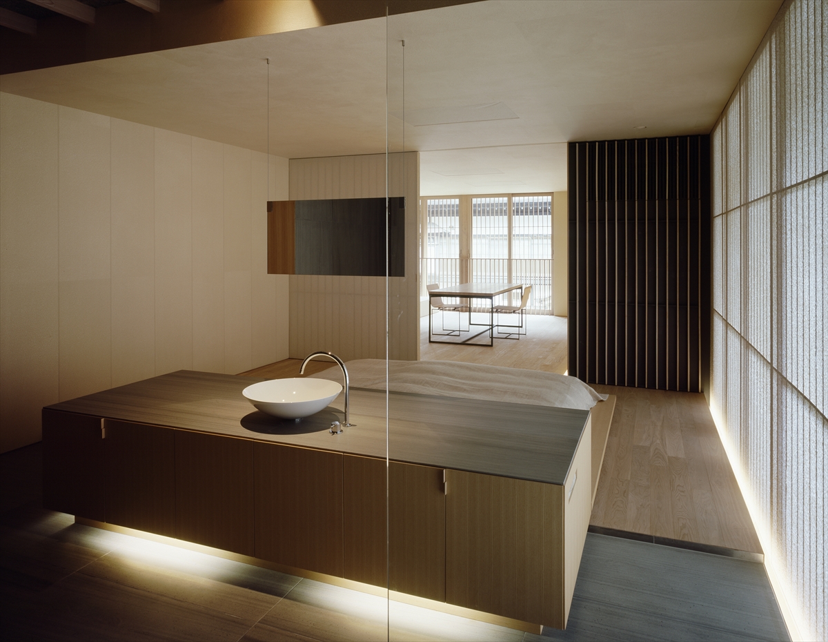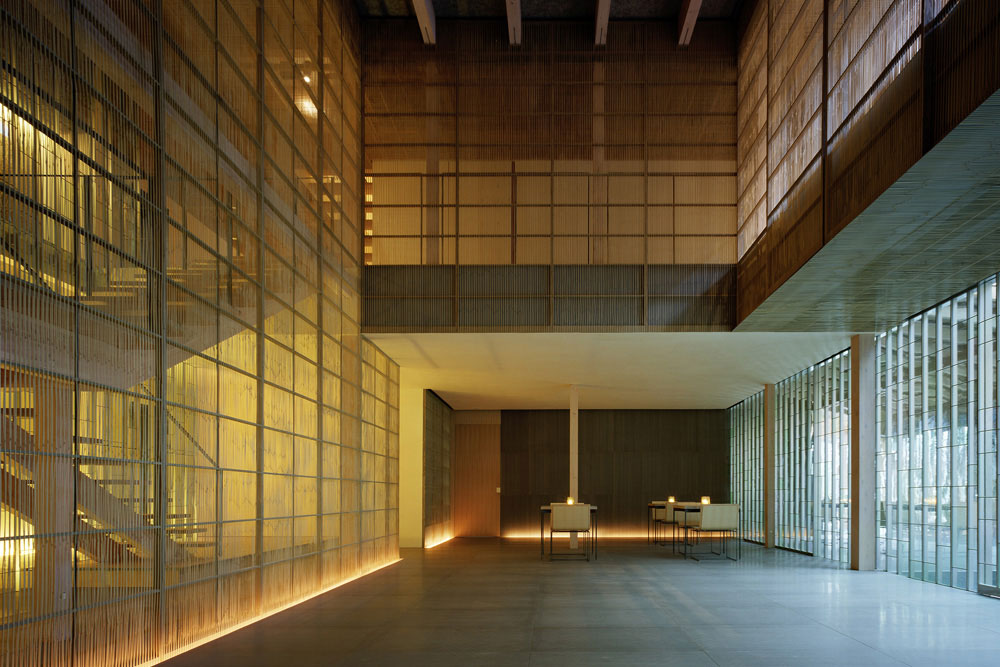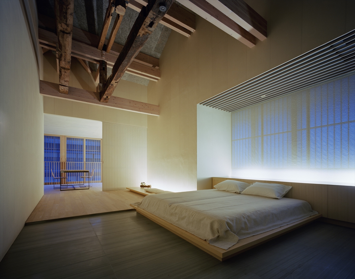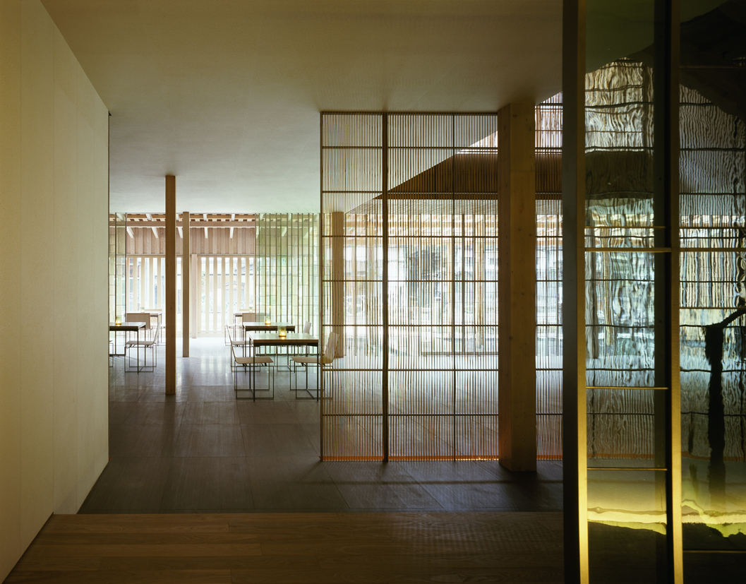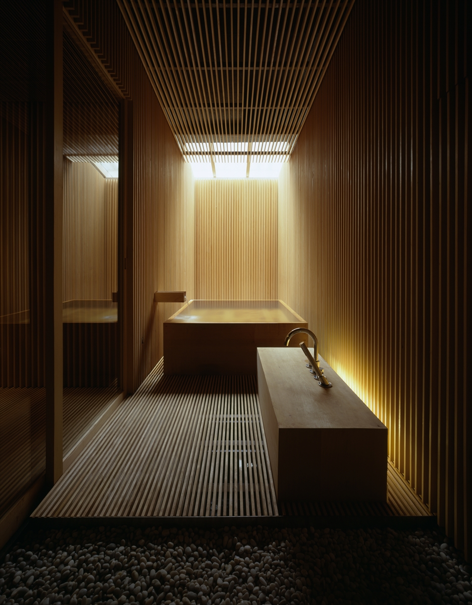 In very small secluded hot spring in Yamagata , Ginzan-Onsen flourished in 1600 for their silver mines. Now hardly any trace of mines except fine quality of mineral contained hot spring. The resort was built in Taisho style architecture with some western influence yet had strong image of traditional Japanese architecture. Architect Kuma was asked to renew one of the most important Inn in the area to receive guests not only from Japan, but from abroad as well. Kuma came out with very interesting design with manipulating Japanese traditional vocabulary overlaying with lighting which is very unique in Ryokan lighting.