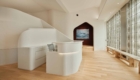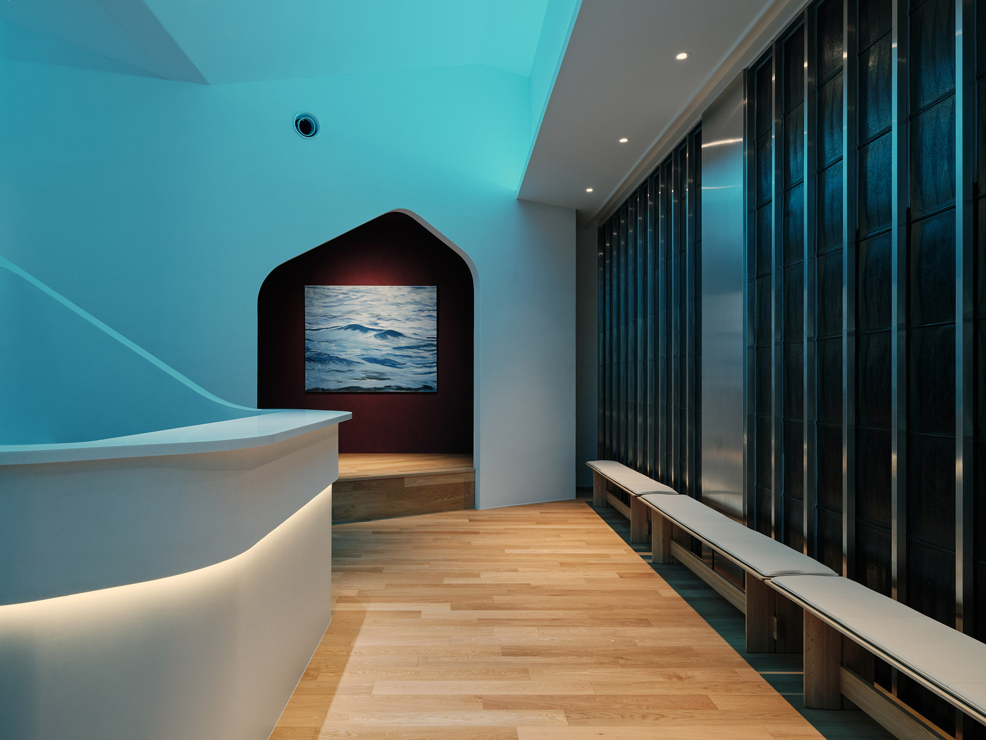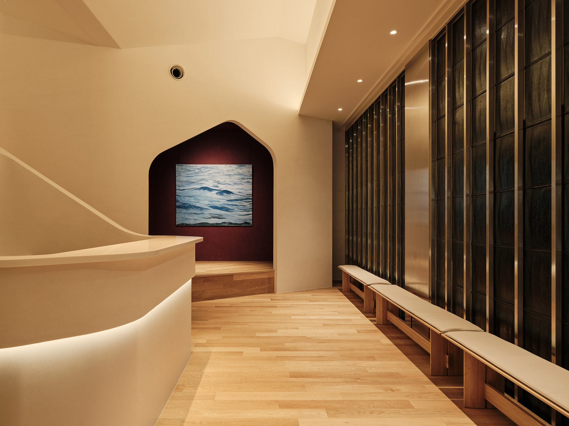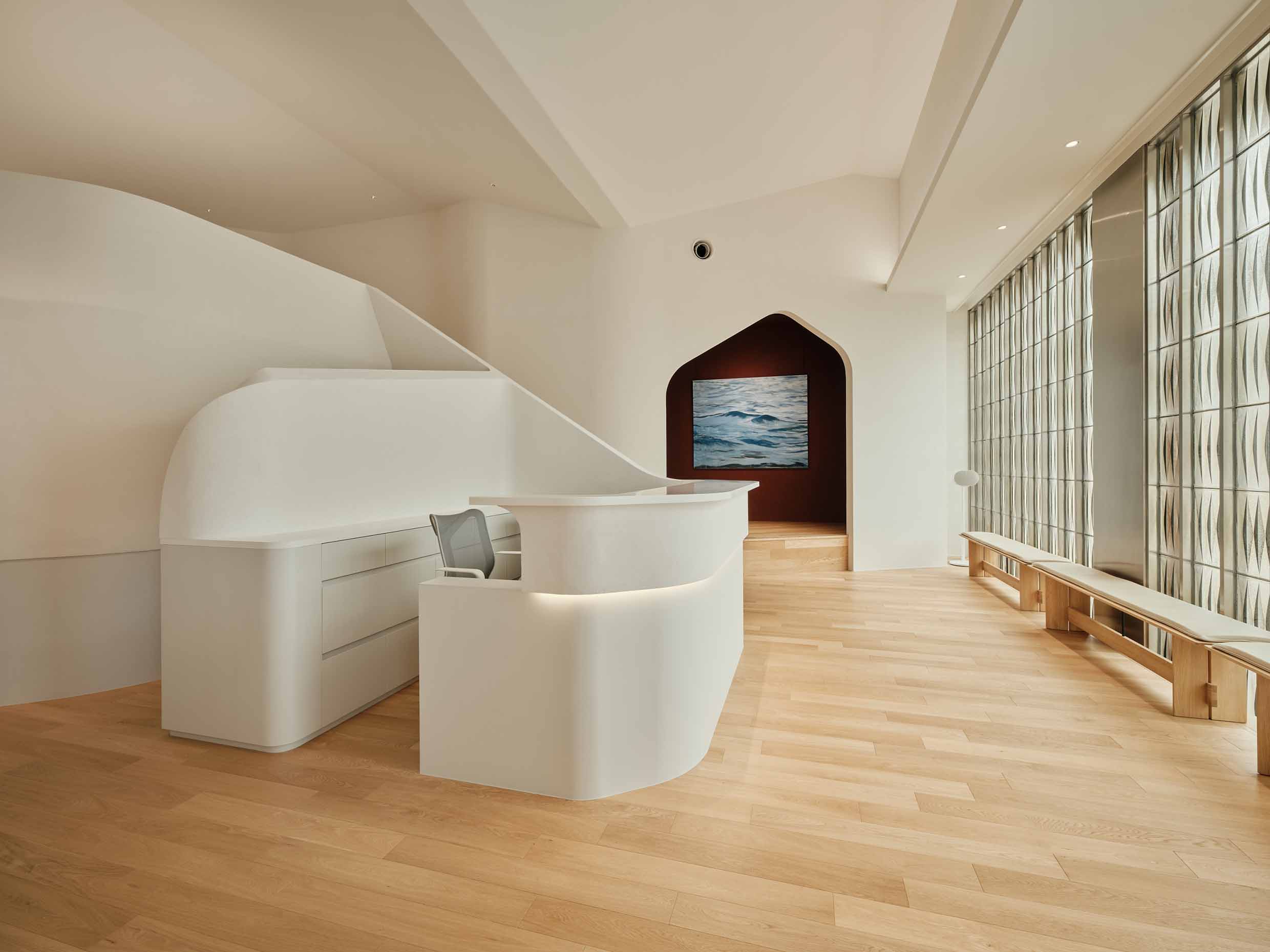 The smooth texture of the plaster walls softly diffuses natural light from the north-facing glass façade as well as indirect lighting, creating a bright and calming atmosphere in the waiting area.