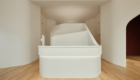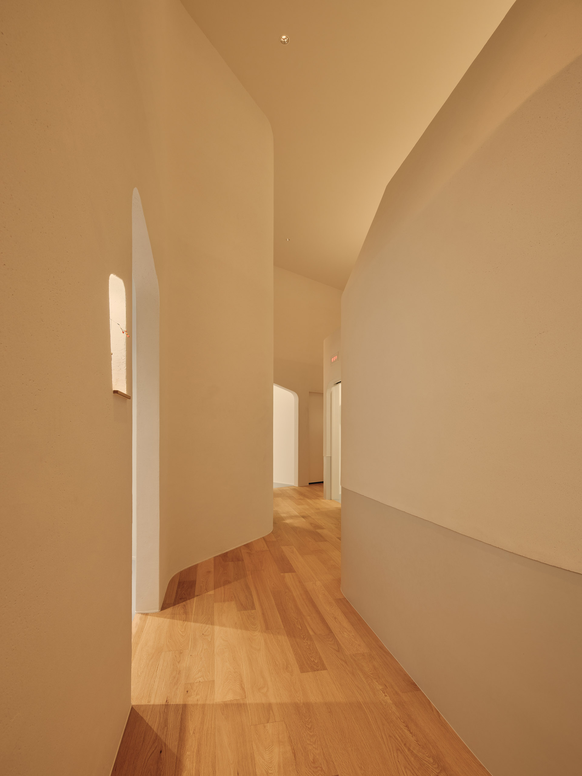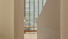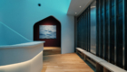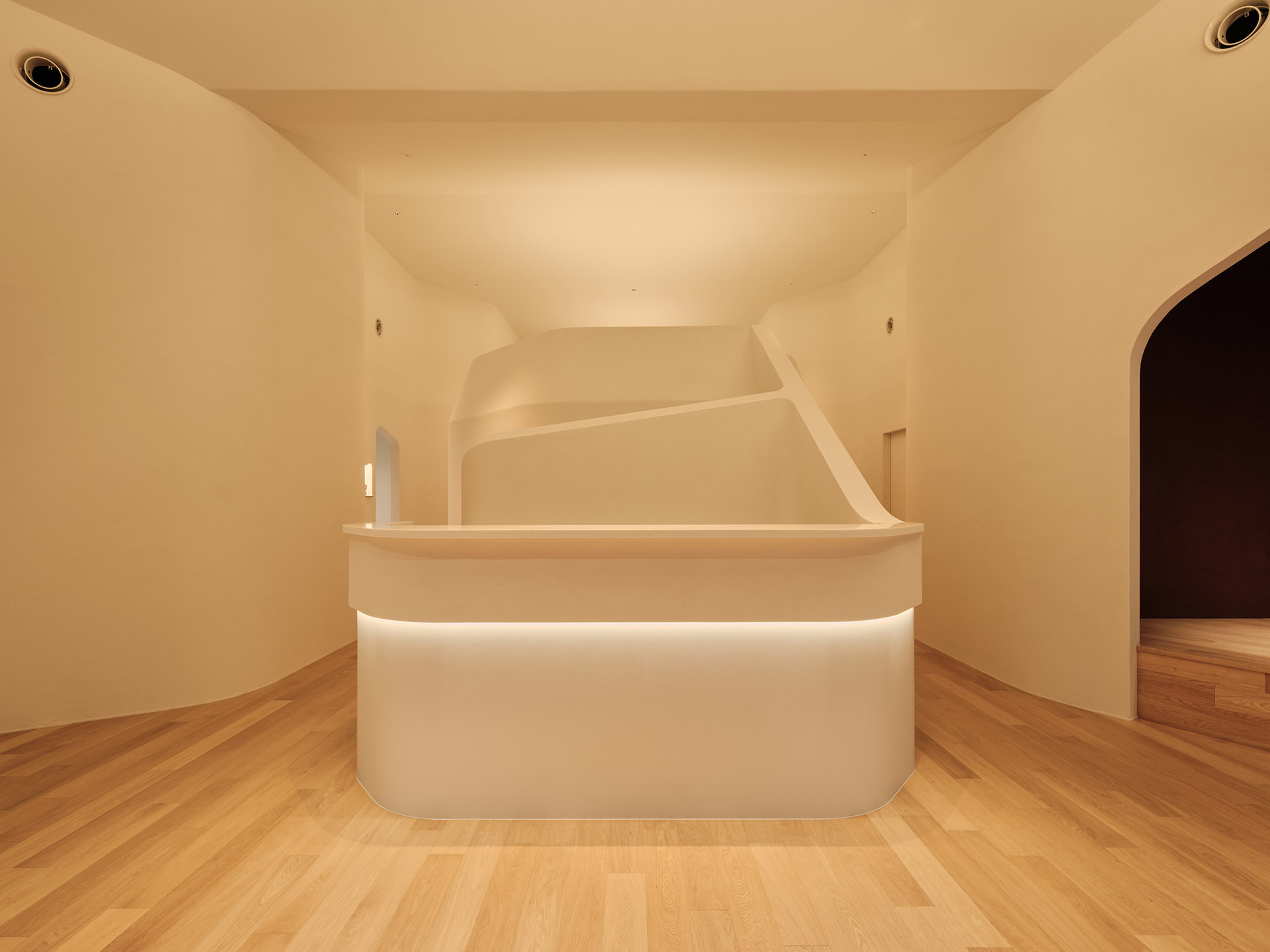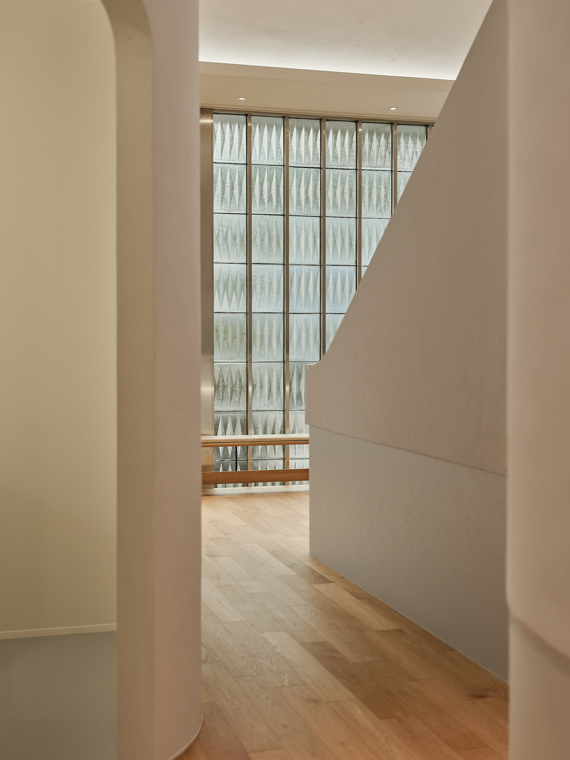The smooth texture of the plaster walls softly diffuses natural light from the north-facing glass façade as well as indirect lighting, creating a bright and calming atmosphere in the waiting area.