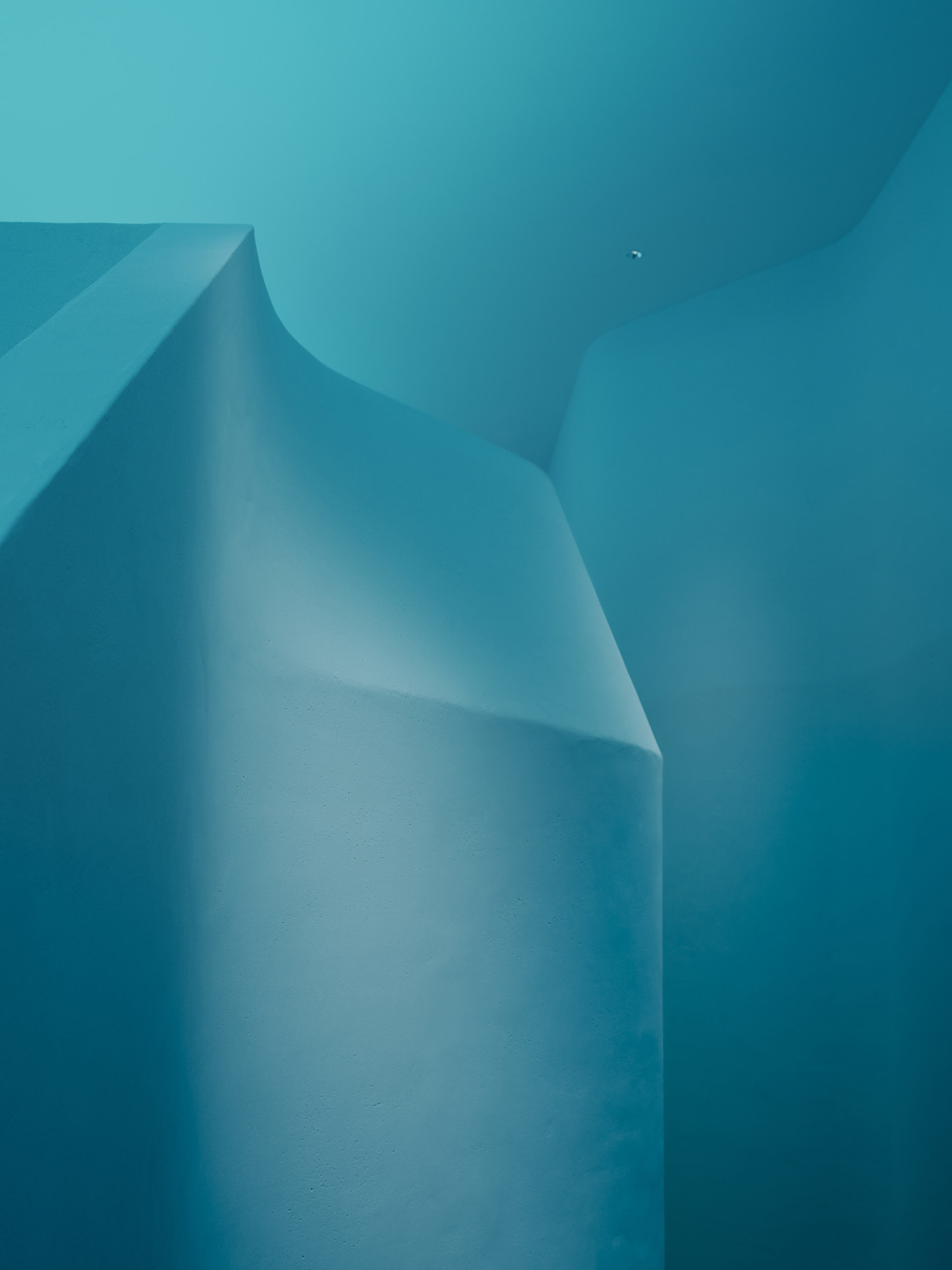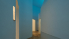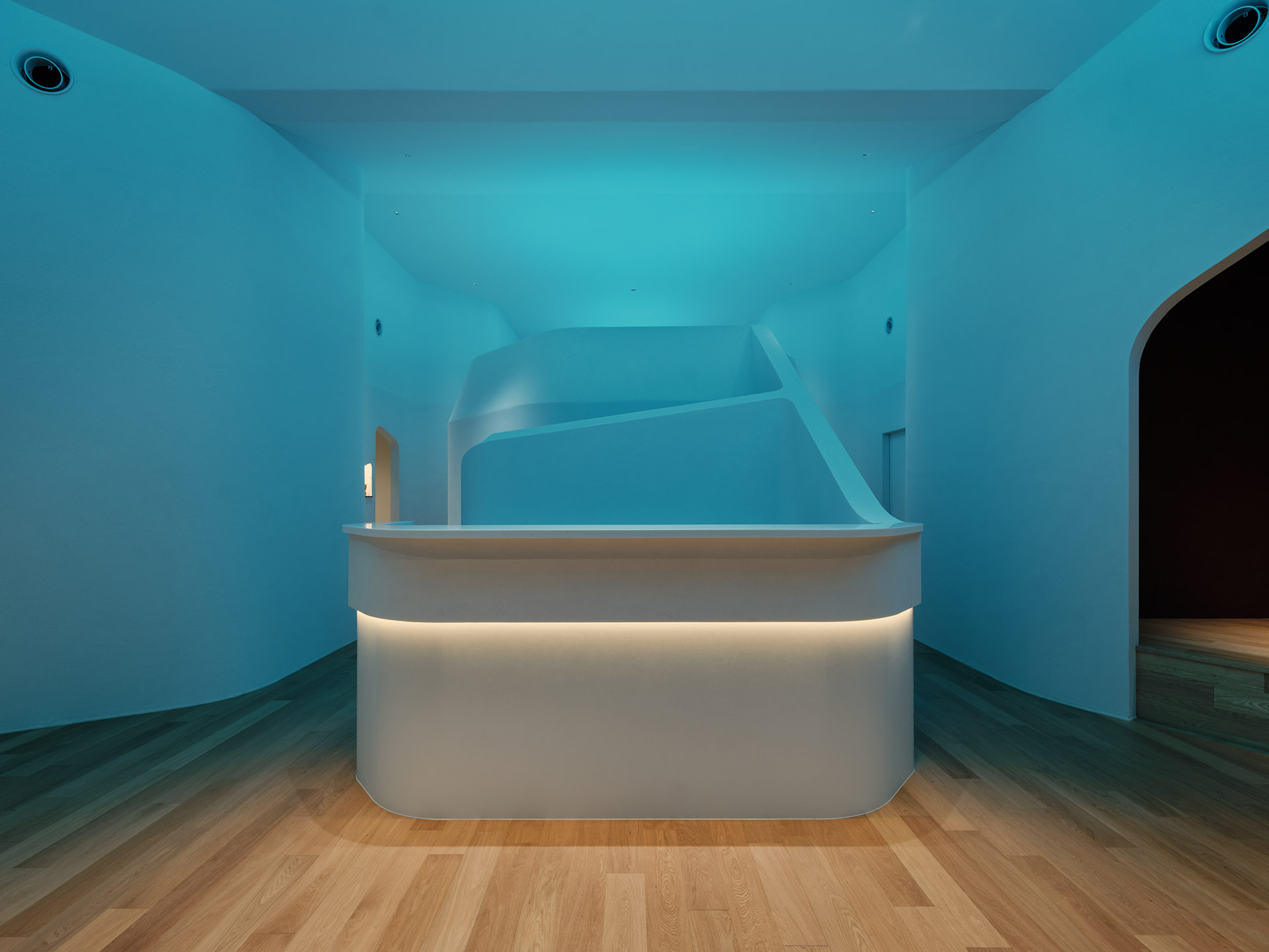 Upper-mounted uplights installed above openings and over the central area of the laboratory utilize circadian lighting with sky-blue Azul light. The reflected light adds a sense of depth to the corridor, creating an immersive experience reminiscent of the Blue Cave.