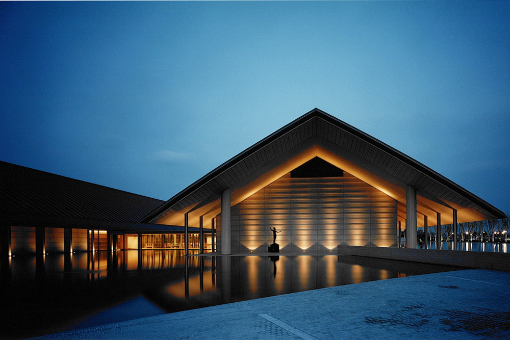 This beautiful museum houses two great existing Japanese artists, Ikuo Hirayama and Churyo Sato. Two wings named after the artists designed over the pond which made the museum floating on the water. When the sunlight hits the water surface, it will reflect and move as wind makes ripples on a underneath of deep eave. At the welcoming entrance, there are only indirect light source located on the entrance which provides warm glow to the space. For the exhibition spaces, we have carefully designed the ceiling not to show the fixtures exposed.