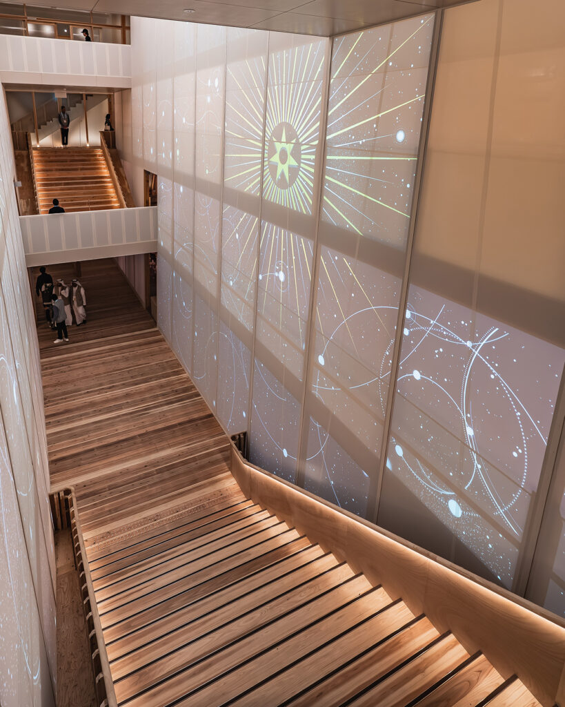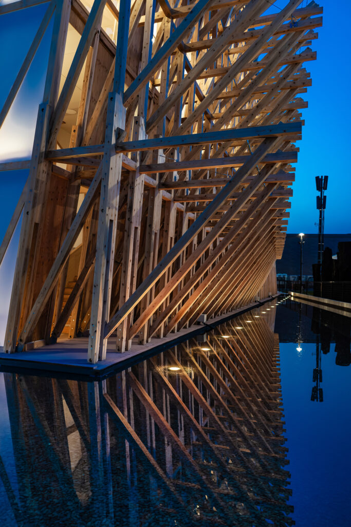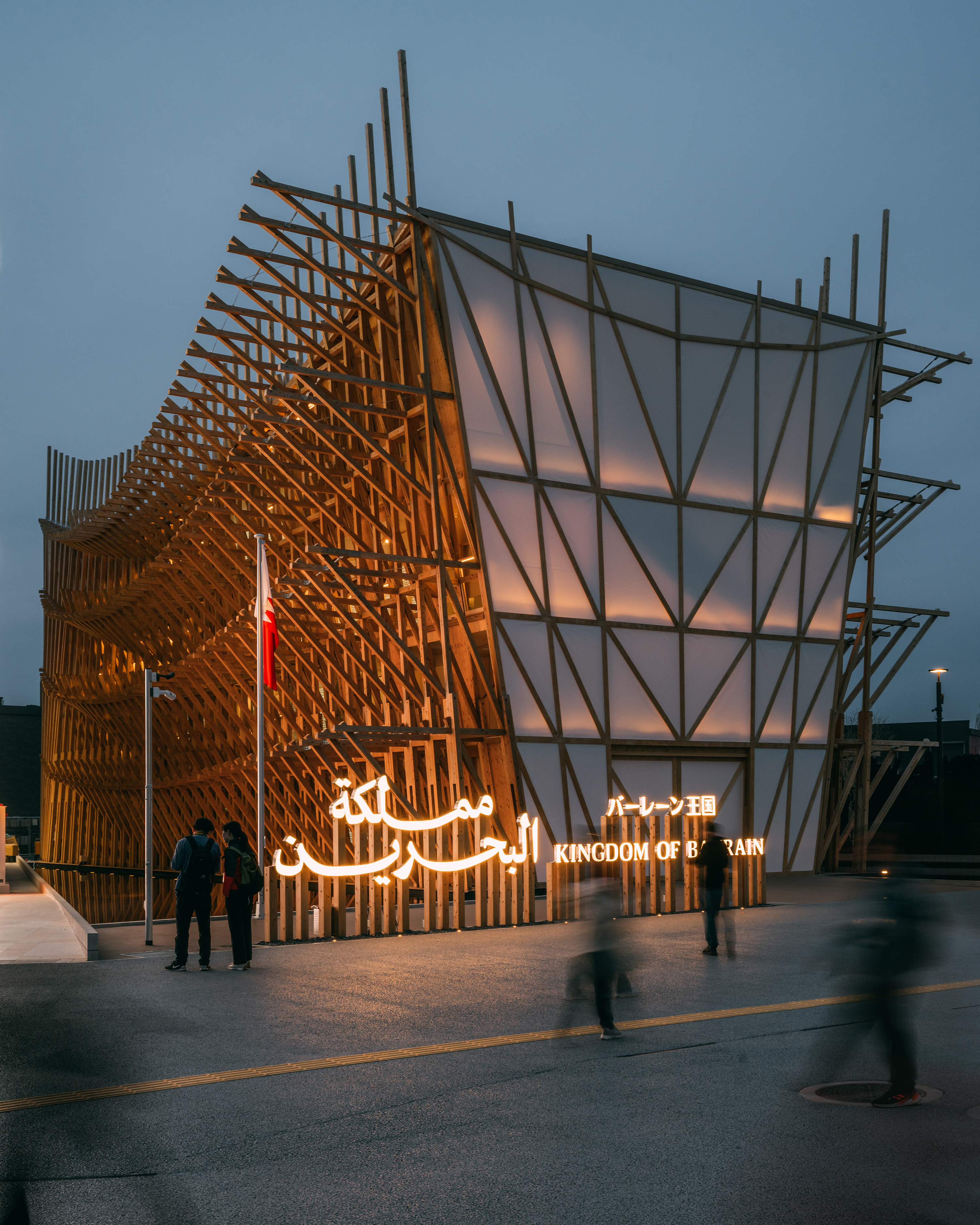 Lina Ghotmeh–Architecture(リナ・ゴットメ・アーキテクチャー)による本パビリオンは、天然真珠の採取に用いられたダウ船(木造帆船)をモチーフとして設計されており、バーレーンの伝統的な造船技術と日本の木工技術が融合した建築です。両サイドにある水盤には水中照明を配置。水面に映る光を木構造へ反射させることで、建築全体が「母なる海」から光を受けて航海するかのような体験を演出します。