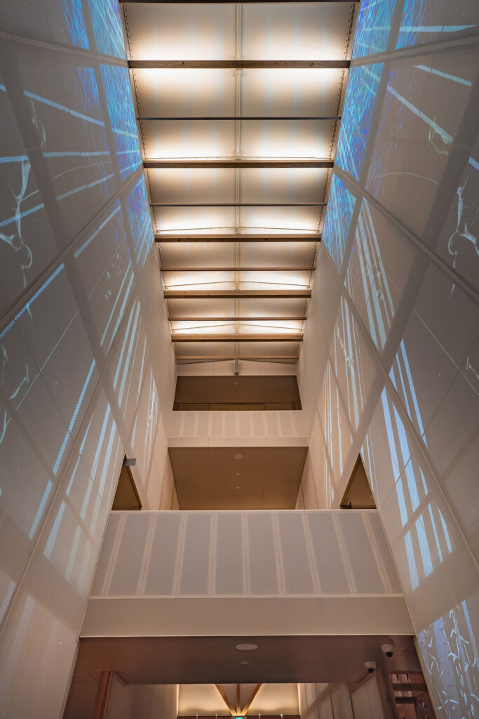展示兼通路空間は足元からの間接光とプロジェクション映像が重なり合い、来訪者は柔らかな光を辿りながら「海中を進む旅」をしているかのような体験をします。